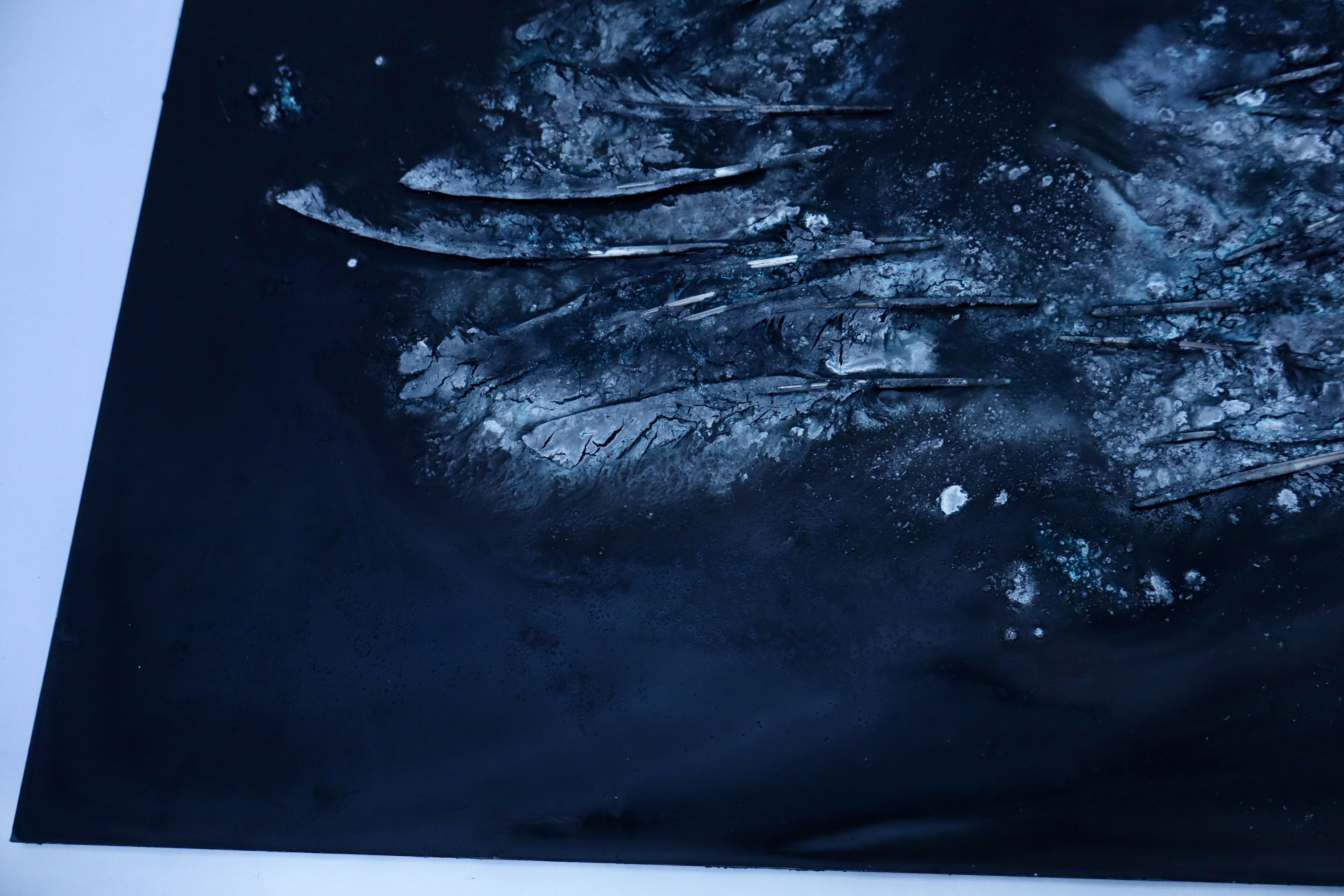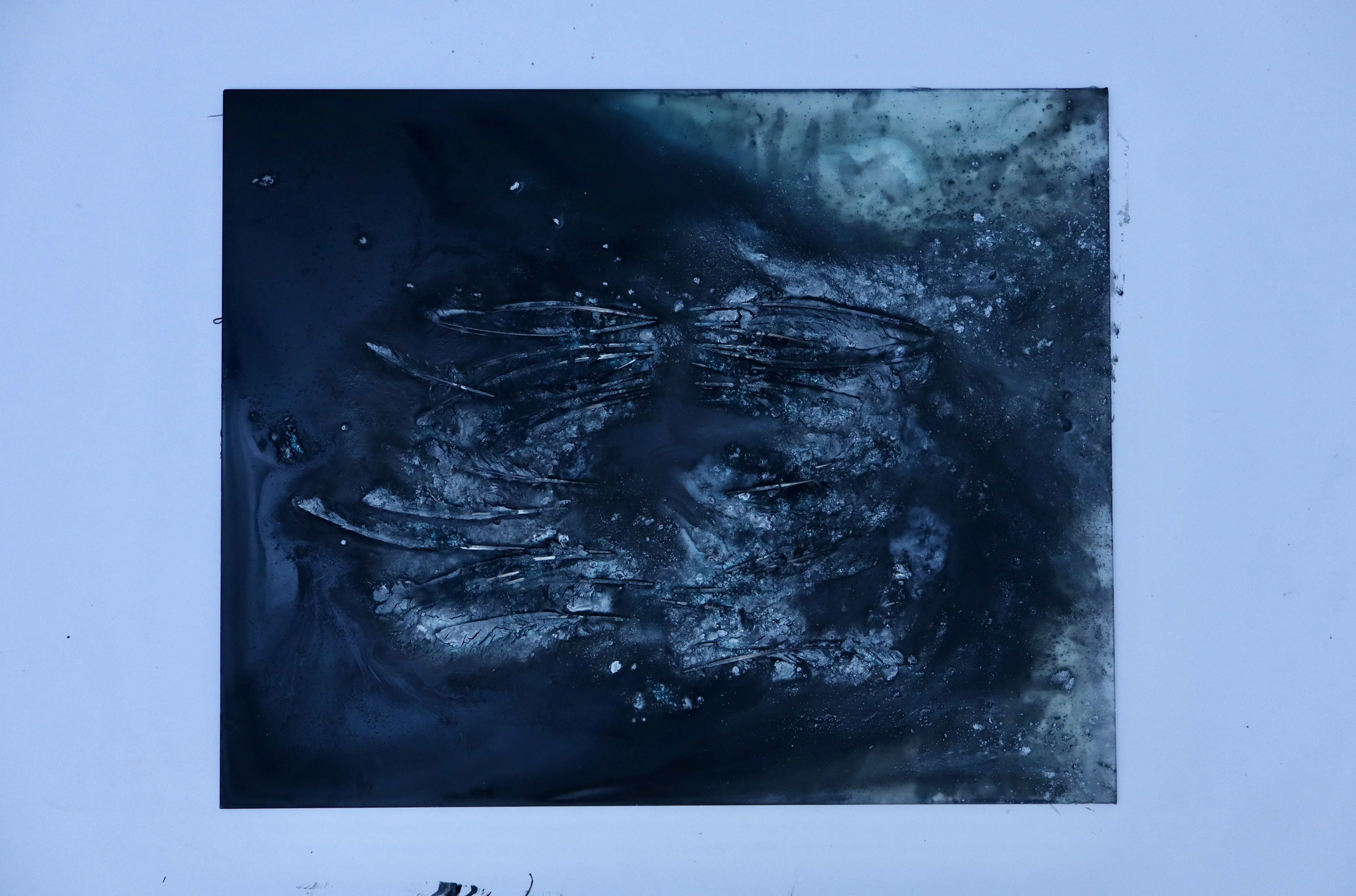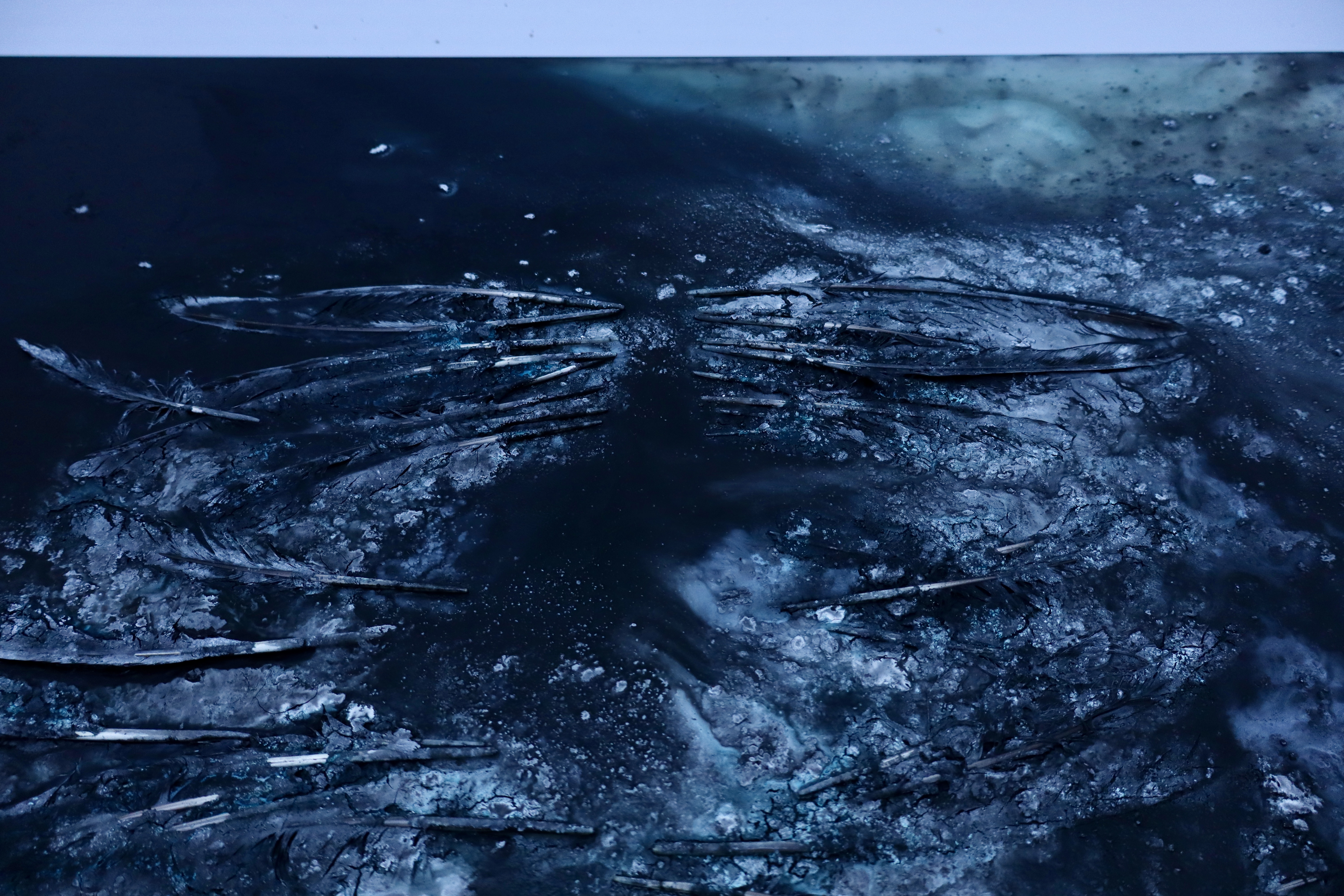 Fallen feathers, ink, clay + water on detached window.